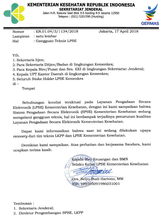 Berikut Surat Edaran dari Kepala Biro Keuangan dan BMN selaku Ketua LPSE Kemenkes RI