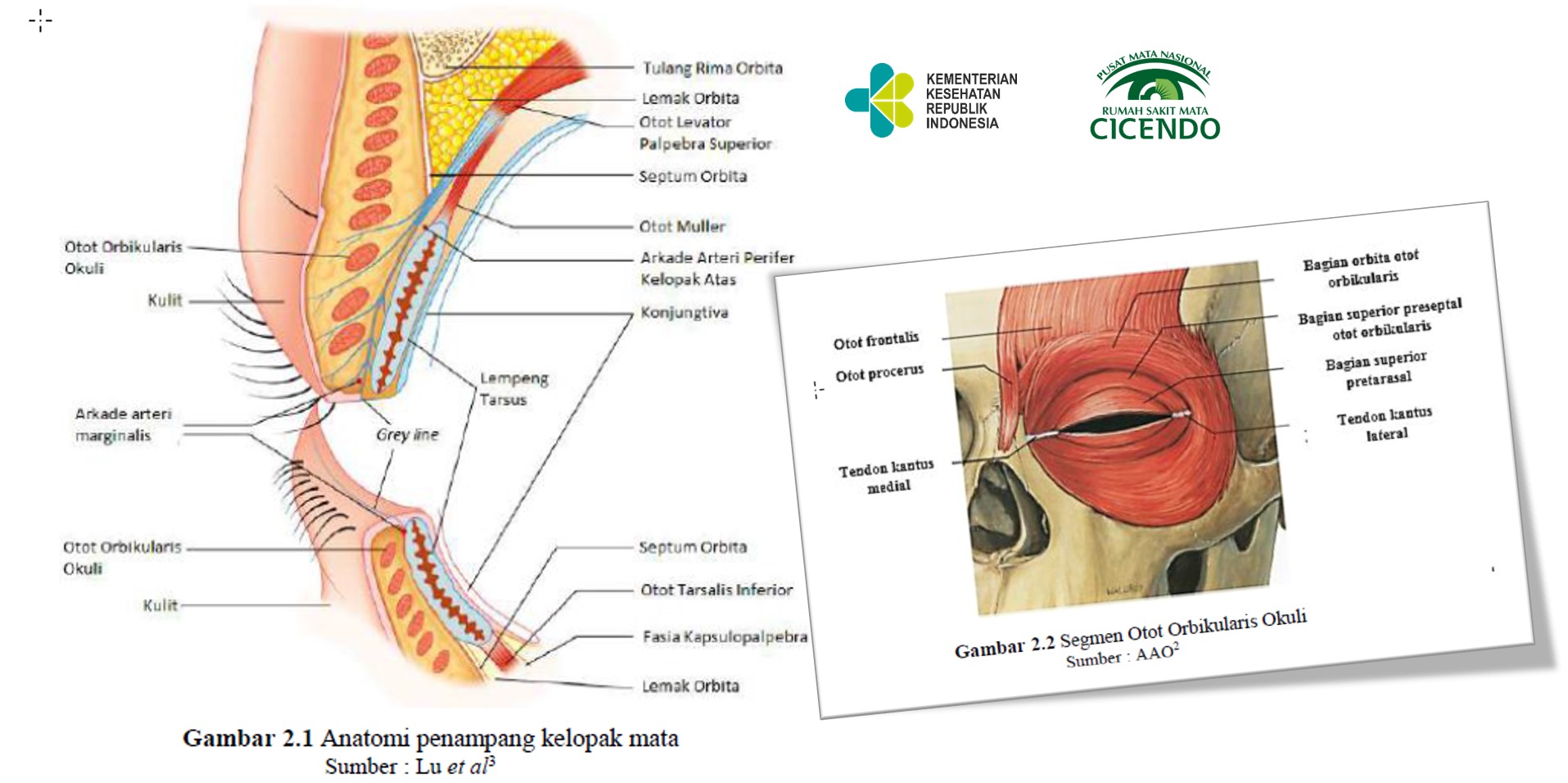 Kelopak mata (palpebra) terdiri dari tujuh lapisan yaitu kulit dan jaringan subkutan, otot protraktor, septum orbita, lemak orbita, otot-otot retraktor, tarsus, dan konjungtiva. Kelopak mata merupakan struktur bilamela yang terdiri dari lamela anterior dan posterior. Lamela anterior terdiri dari kulit dan otot orbikularis okuli. Lamela posterior terdiri dari lempeng tarsus dan konjungtiva. Kulit palpebra merupakan lapisan kulit paling tipis pada tubuh manusia dan tidak memiliki lapisan lemak subkutan. Pada palpebra superior dan inferior terdapat kerutan (eyelid crease) dan lipatan (eyelid fold). Posisi eyelid crease menunjukkan perlekatan antara levator aponeurosis dengan bagian pretarsal otot orbikularis okuli dan kulit. Eyelid fold terdiri dari jaringan kulit preseptal dan jaringan subkutan di atas struktur levator aponeurosis dan septum.